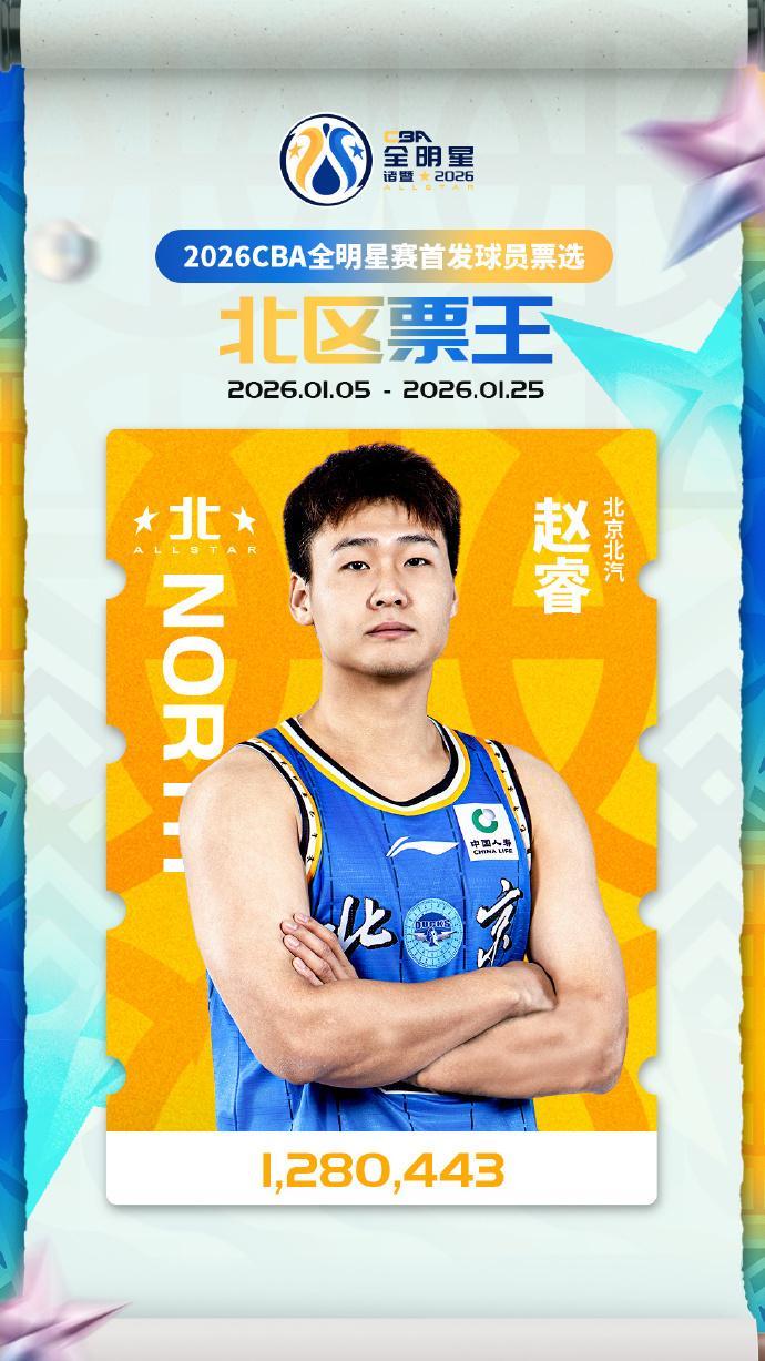 北京时间1月26日,CBA官方公布2026年全明星赛首发阵容,徐杰以1,654,042票当选南区票王,并且连续两年蝉联总票王成为历史第4人,南区首发5人分别是贺希宁、胡金秋、郭昊文、徐杰、庞峥麟;赵睿以1,280,443票当选北区票王,北区首发5人分别是曾凡博、齐麟、付豪、赵睿、廖三宁。